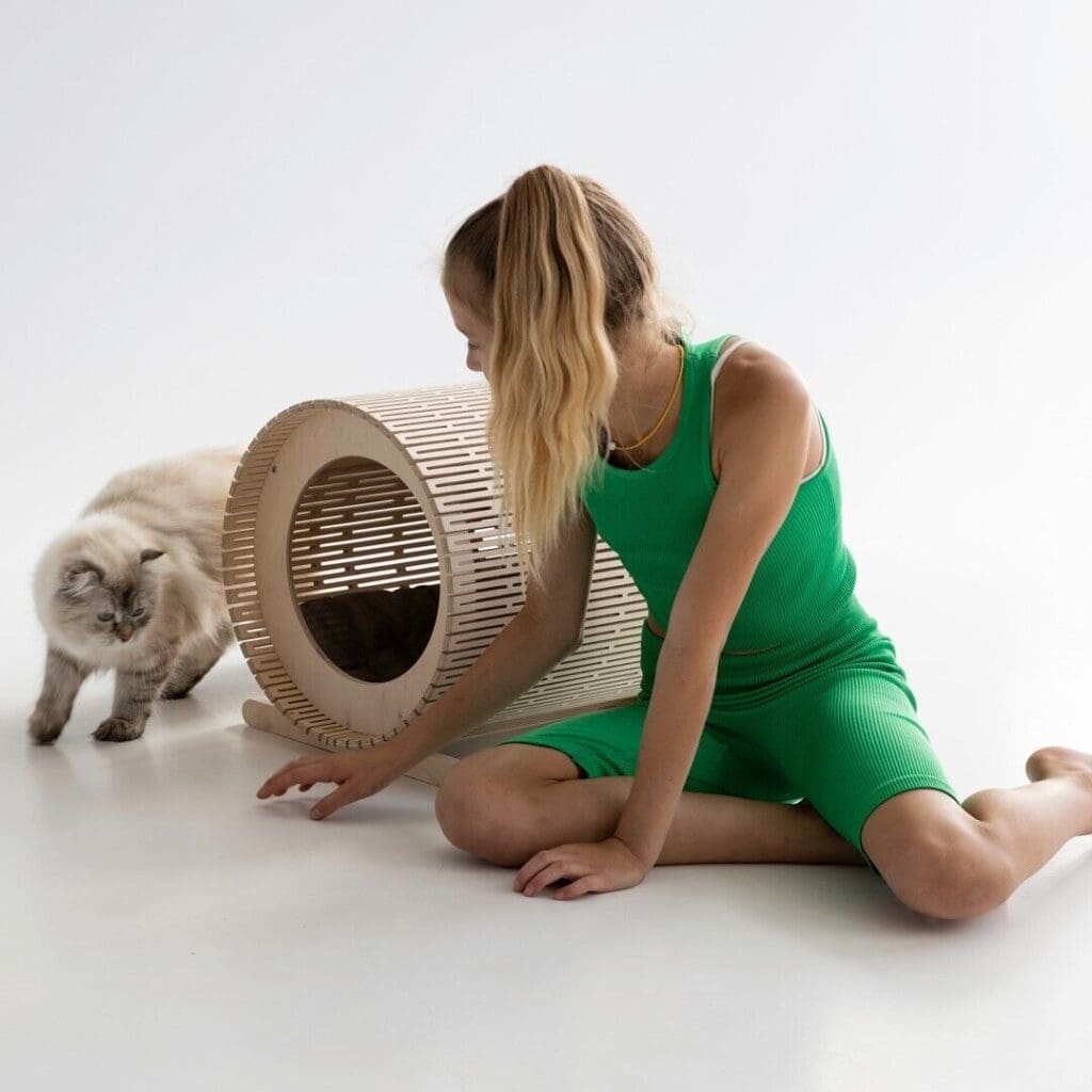 Esta casa para gatos combina belleza y funcionalidad, brindando un refugio acogedor y respetuoso con el medio ambiente para tu querida mascota.